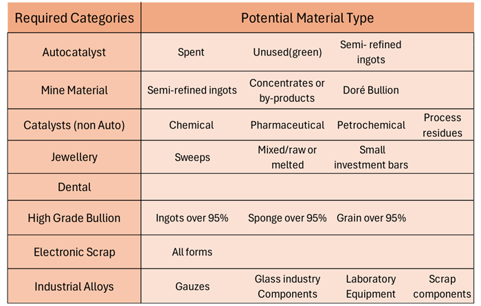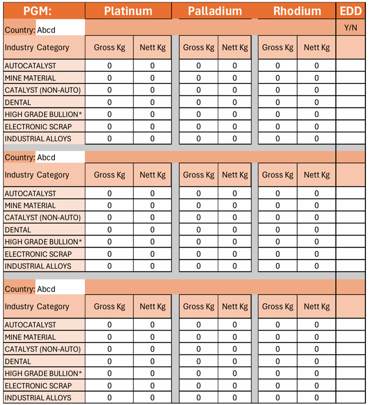 - The Country of Origin of all Pt/Pd/Rh in all forms, including those received for refining or processing. To be reported by the following material types: Autocatalyst, Mine Material, Catalysts (non-auto), Jewellery, Dental, High-Grade Bullion, Electronic Scrap or Industrial Alloys. Further explanation of the eight material types shown in the table below.